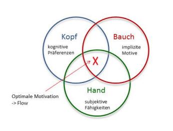 Die wissenschaftlichen Untersuchungen am Lehrstuhl Kehr haben ergeben, dass die drei Komponenten Hand, Kopf und Bauch Einfluss auf die intrinsische Motivation haben. Stehen die Komponenten mit der gefragten Tätigkeit in Einklang, dann sind die Voraussetzungen geschaffen diese leicht, mit Freunde – eben im Flow zu erledigen.